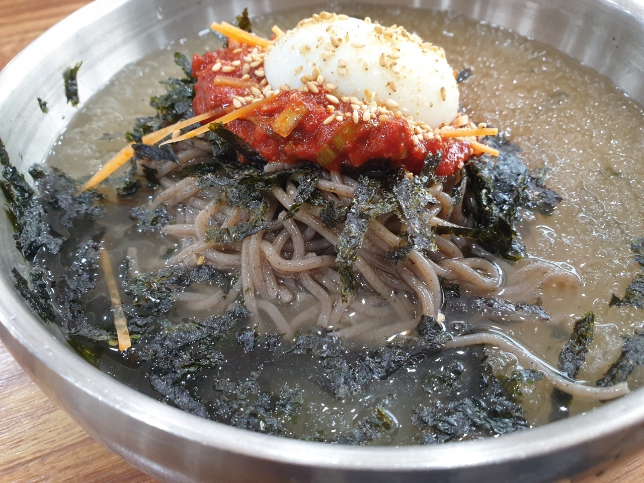 막국수는 얼음육수와 함께 김가루가 솔솔 뿌려지고 비빔장과 함께 계란이 올려져 나온다.